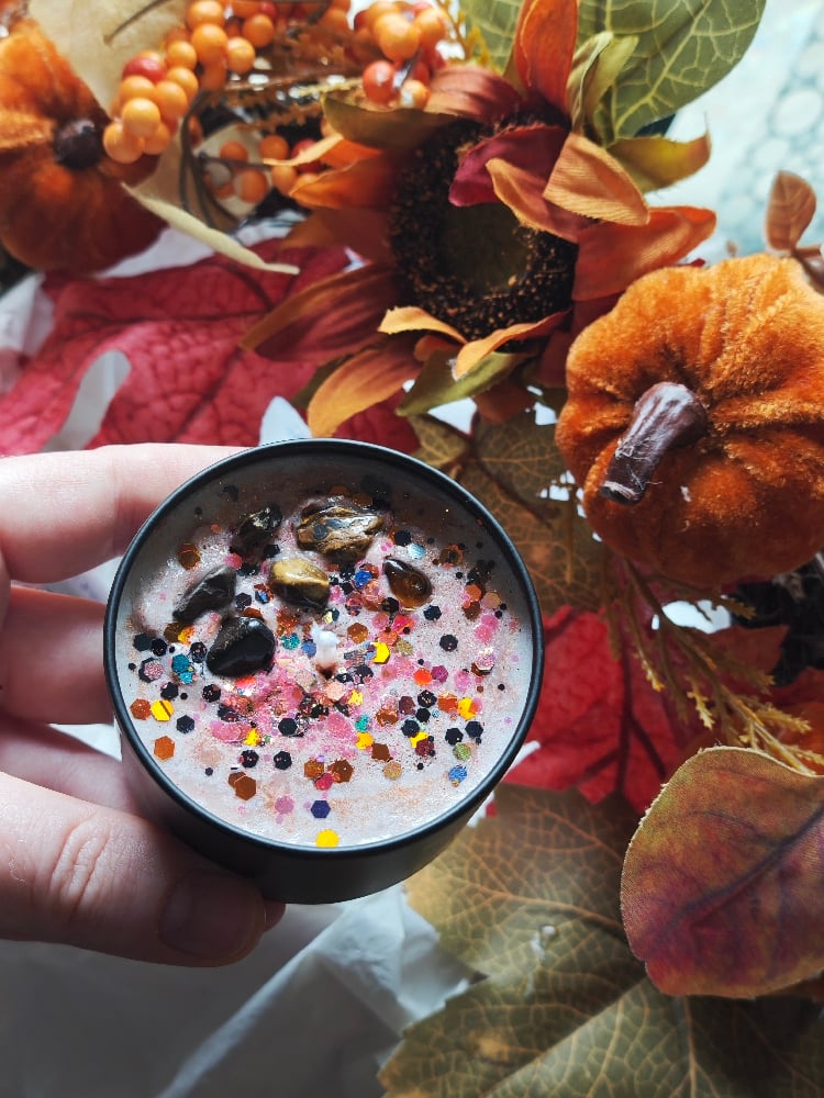 Vela pastel de calabaza y canela con piedras ojo de tigre